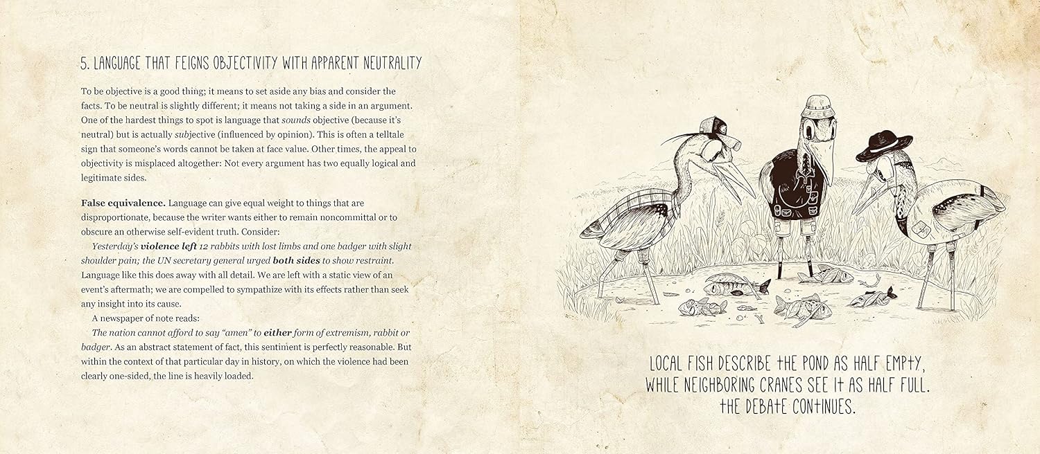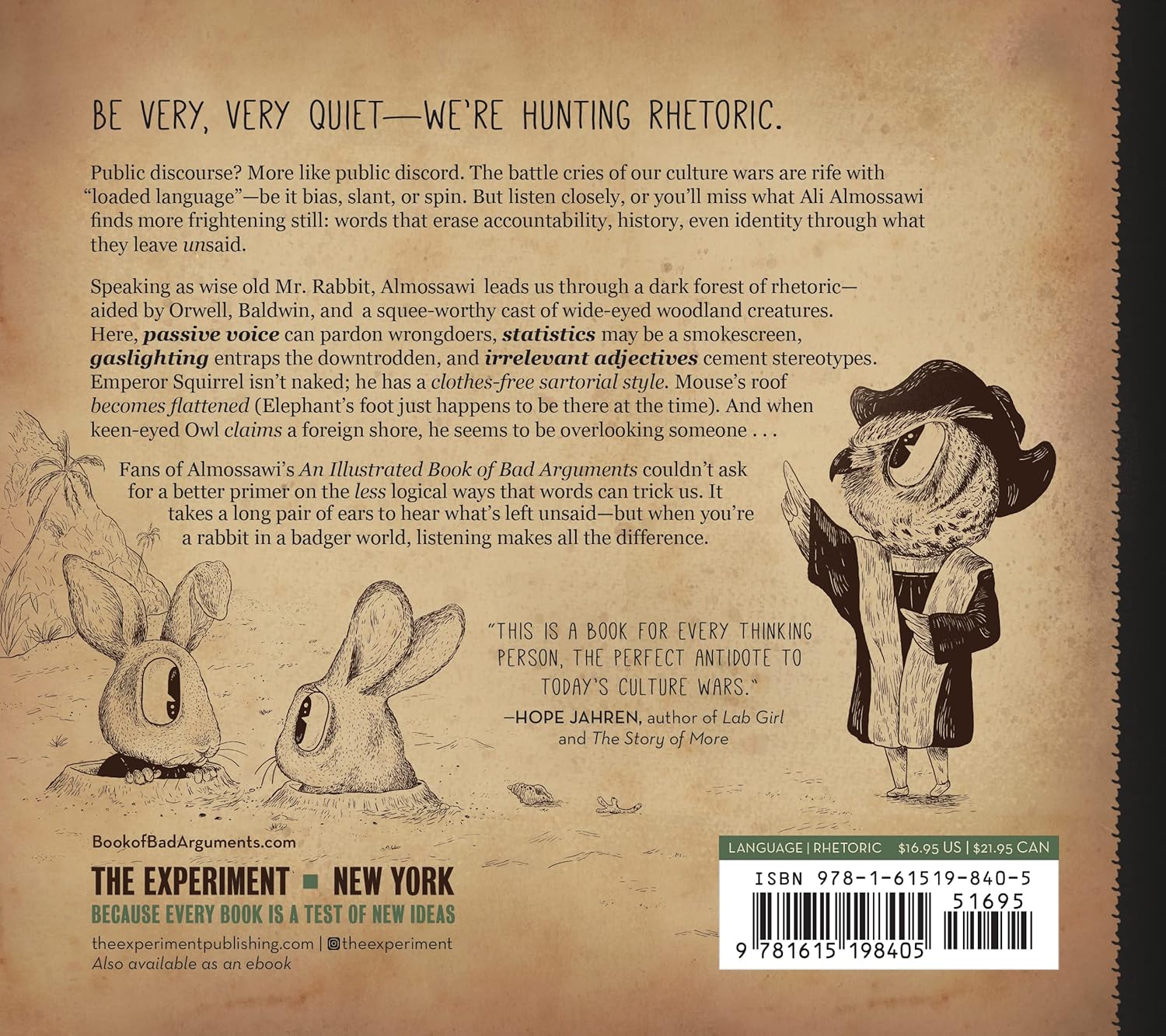 Speaking as wise old Mr. Rabbit, Almossawi leads us through a dark forest of rhetoric—aided by Orwell, Baldwin, and a squee-worthy cast of wide-eyed woodland creatures. Here, passive voice can pardon wrongdoers, statistics may be a smokescreen, gaslighting entraps the downtrodden, and irrelevant adjectives cement stereotypes. Emperor Squirrel isn’t naked; he has a clothes-free sartorial style. Mouse’s roof becomes flattened (Elephant’s foot just happens to be there at the time). And when keen-eyed Owl claims a foreign shore, he seems to be overlooking someone . . .