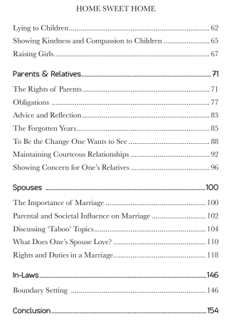 At its core, Home Sweet Home is about relationships: the power it has over one’s sense of peace and self and how knowing one’s rights and duties can empower one to confidently set boundaries. Most importantly, it discusses issues and conflicts that may exist within the home and how to ensure they are not mismanaged and handled disproportionately. It emphasizes the need to reflect and ponder over the origins of conflict and aims to make its readers more cognizant of the Islamic principles related to every relationship and interaction. In particular, there is a focus on the positive impact faith can have on smoothing out many common problems.