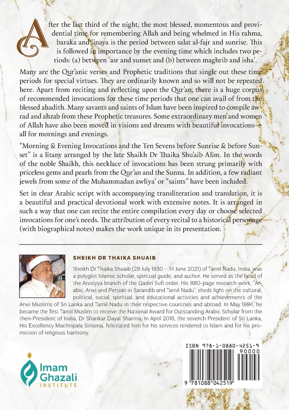 "Morning & Evening Invocations and the Ten Sevens before Sunrise & before Sunset" is a litany arranged by the late Shaikh Dr Thaika Shu'aib Alim. In the words of the noble Shaikh, this necklace of invocations has been strung primarily with priceless gems and pearls from the Qur'an and the Sunna. In addition, a few radiant jewels from some of the Muhammadan awliya' or "saints" have been included.