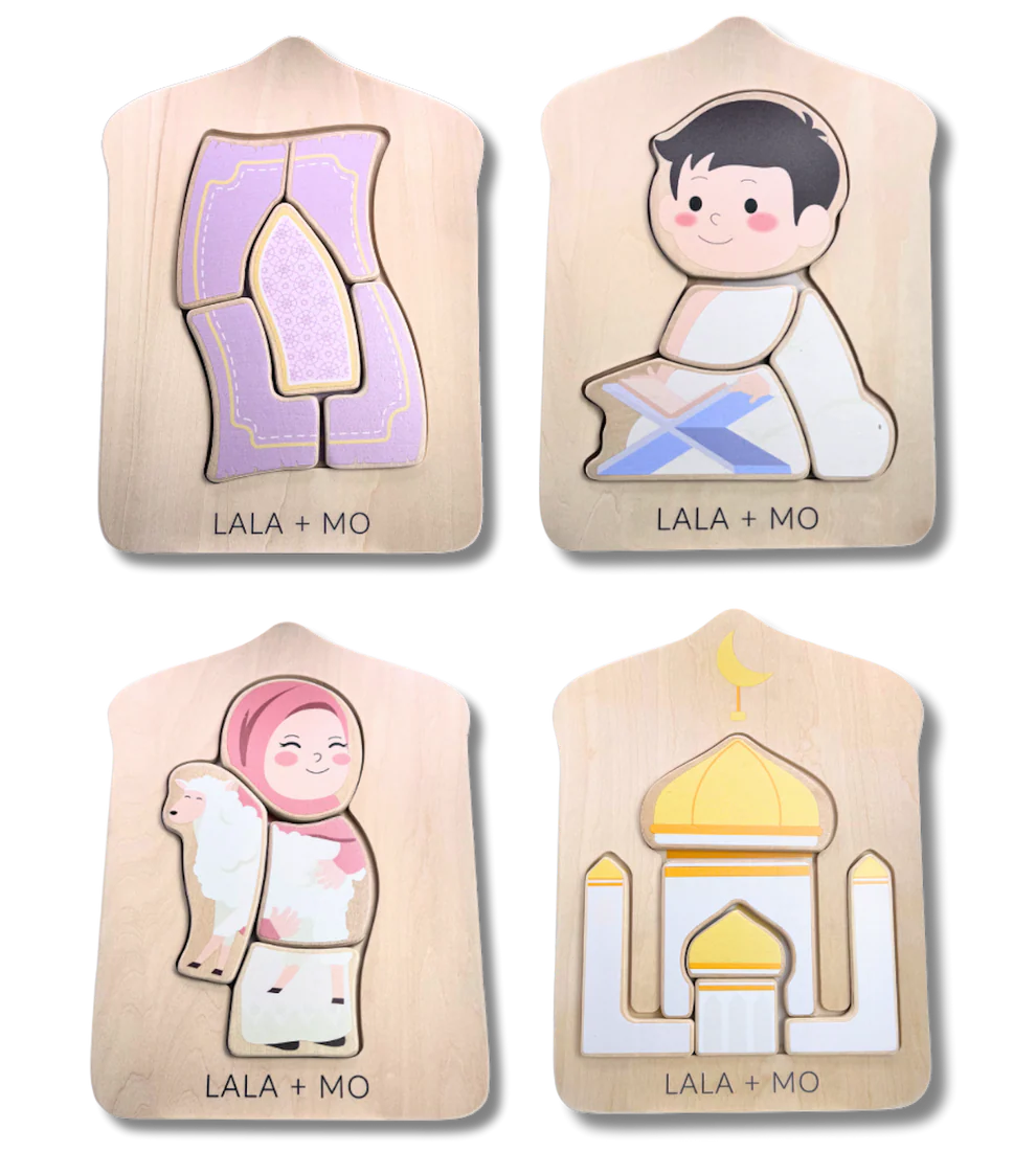 With the Chunky Islamic Block Puzzles, your child can dive into imaginative play while exploring Islamic themes. This set features four chunky block puzzles showcasing a prayer rug, mosque, Muslim boy, and Muslim girl.