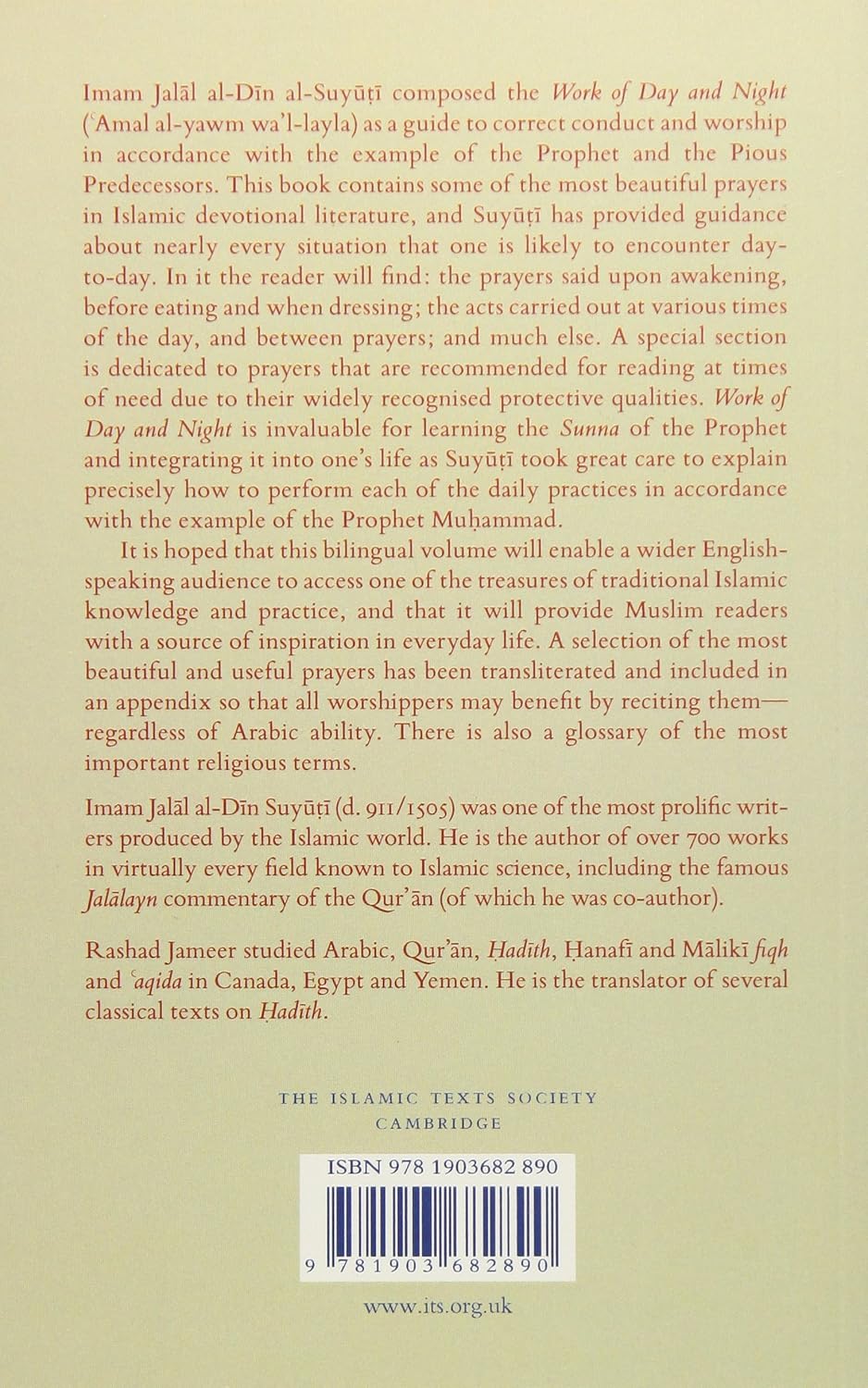 Imam Jalal al-Din Suyuti (d. 911/1505) was one of the most prolific writers produced by the Islamic world. He is the author of over 700 works in virtually every field known to Islamic science, including the famous Jalalayn commentary of the Qur’an (of which he was co-author). His works are still widely used, and his name is a by-word for breadth of learning, voluminous output and a saintly life. The Work of Day and Night is Imam Suyuti’s collection of the daily and nightly practices of the Prophet of Islam and includes instructions on how to follow the Prophet in everyday actions and supplications. In it the reader will find: the prayers said upon awakening, before eating and when dressing; the acts carried out at various times of the day, and between prayers; the supplications recited in times of distress as well as of intimacy with God; and much else. This book is invaluable for learning the practices of the Prophet and integrating it into one’s life.