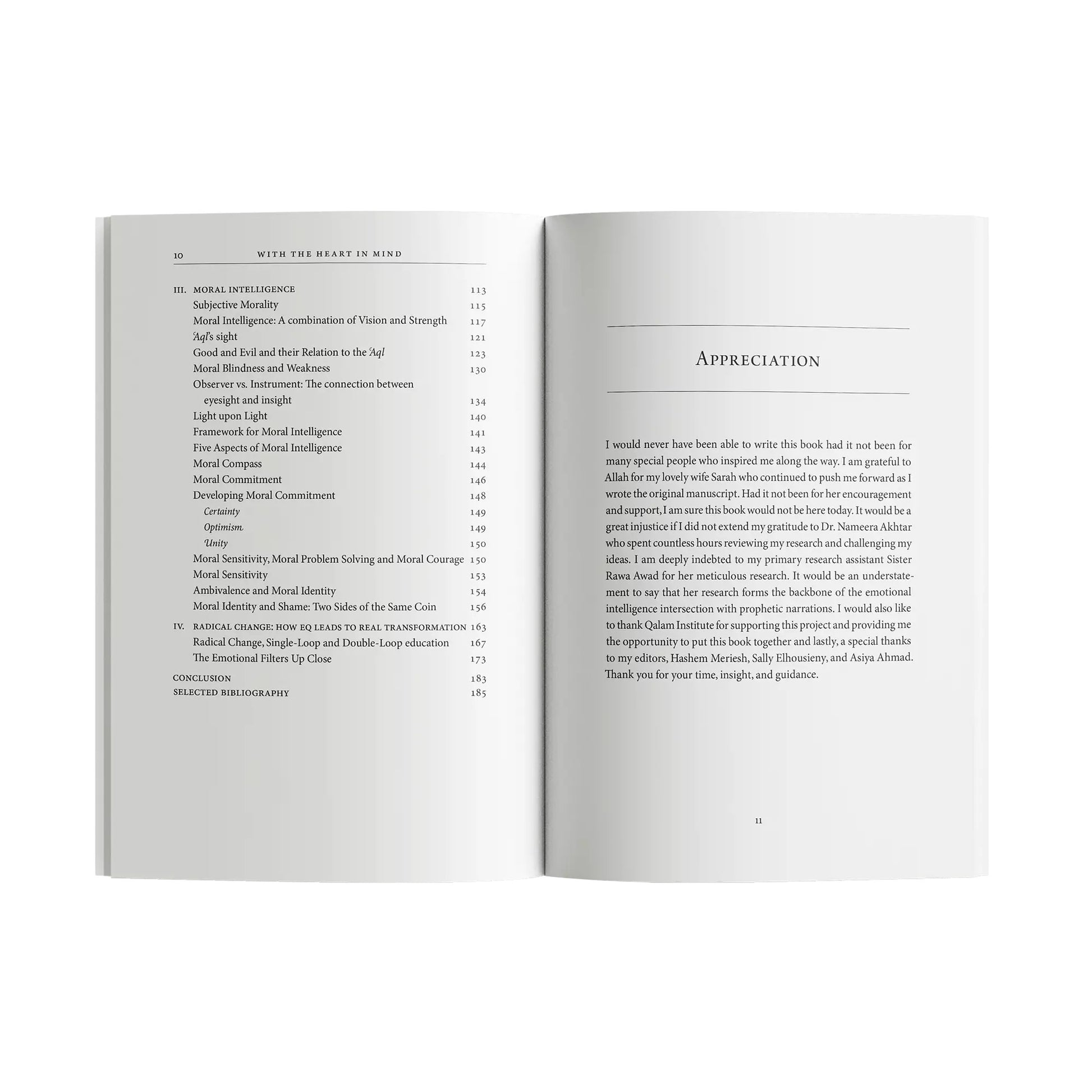 The author suggests that by studying the Emotional Intelligence of the Prophet Muhammad (s.a.w.), we improve the quality of our relationships with the people around us and we, like the Prophet (s.a.w.), can become catalysts for change around us. Emotional Intelligence within the author's model of intelligence is a tool by which the message of God is transferred to humanity. With the Heart in Mind reminds us that "To be loved by people is half of intelligence."